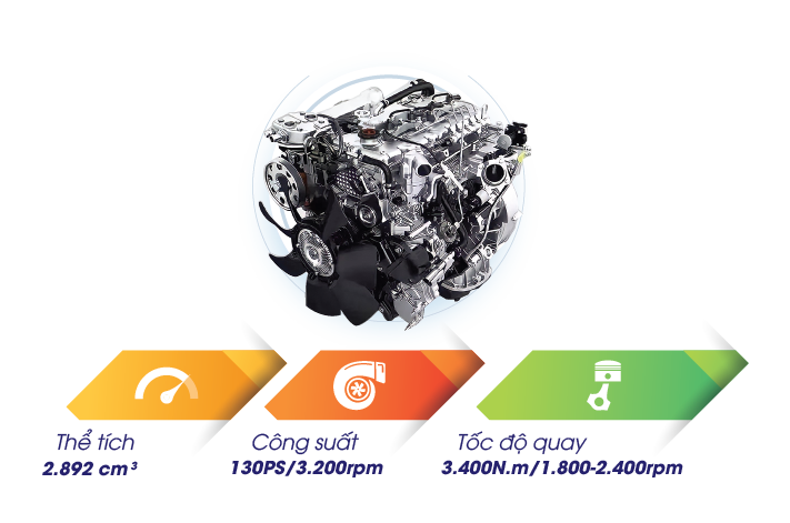 Động cơ JX493ZLQ4 bền bỉ và khỏe khoắn. Công suất: 106PS/3.400rpm; Momen xoắn: 260N.m/2.000rpm; Dung tích xylanh: 2.771cc